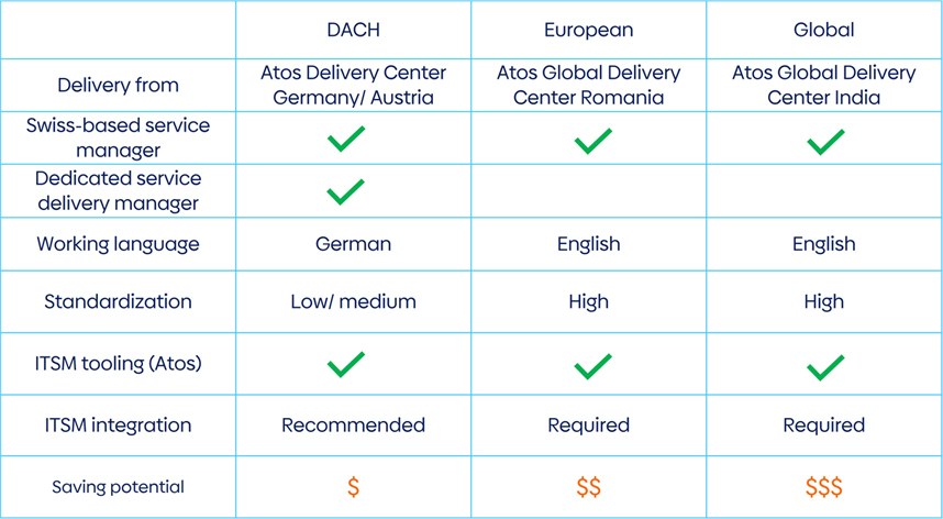 Atos Switzerland’s flexible and adaptive delivery model has been designed specifically for our local market and is unique in its kind. We work with you to select the best starting point in terms of service delivery, language and standardization. Throughout our journey together, we leverage local, European, or global delivery capabilities according to your evolving business and technological priorities, ensuring the same level of quality and guaranteeing security as we advance jointly, at your pace.