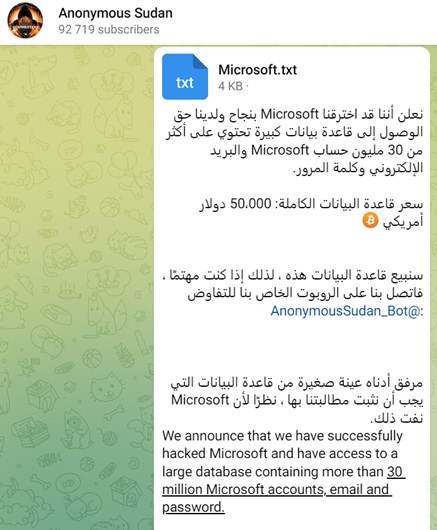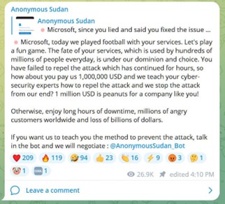 Figure 1 Anonymous Sudan post about attacks on Microsoft