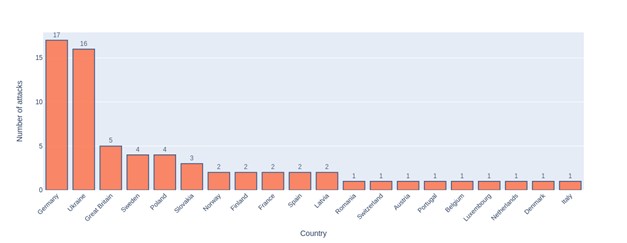 The UserSec group channel contains 59 posts mentioning attacks on European entities [Figure 4]. These attacks are highly correlated with information about countries supporting Ukraine in the war with Russia. Furthermore, most of the attacks are targeted at NATO member countries. As mentioned earlier, UserSec joined a campaign whose primary objective is to attack NATO members. Notably, only two countries in the given data are not members of NATO (Sweden and Ukraine).