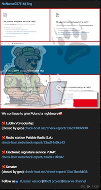 Figure 3 Example announcement from NoName057(16) on English channel about attack on Polish entities