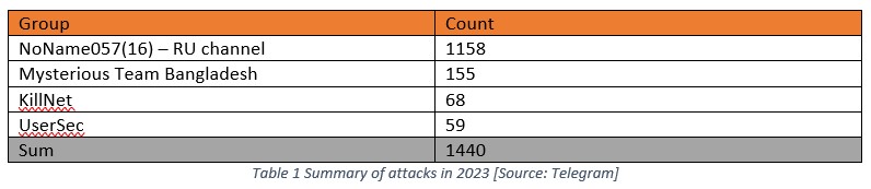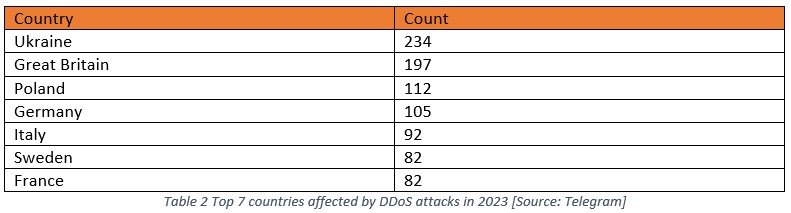 Table 2 provides a summary of the Top 7 countries that were targeted by DDoS groups in 2023. It is noteworthy that the NoName057(16) group was responsible for a significant proportion of these attacks, as highlighted in Table 1. This group has conducted the highest number of attacks in 2023, making it a key contributor to the overall count. Given these findings, it is important to acknowledge the impact of the NoName057(16) group in this summary.